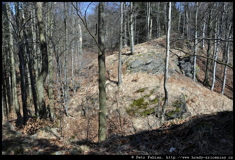 Hlodný nejvyšší část hradu, vlevo šíjový příkop (2018) |