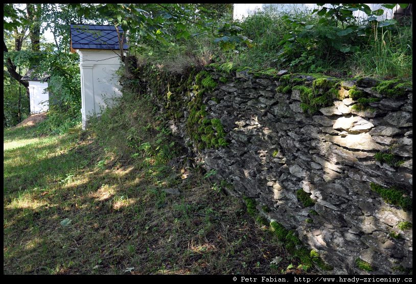 Moravský Beroun v popředí zídka snad využívající zdivo hradu (2022) |