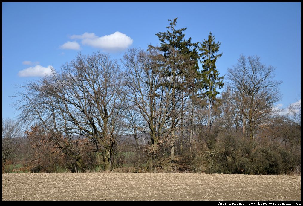 Otěhřiby pohled k tvrzišti (vpravo) z cesty od JZ (2024) |