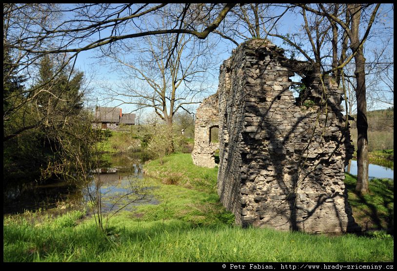 Martinice vlevo sousední budova, vpravo zdivo vnitřní zástavby tvrze (2016) |