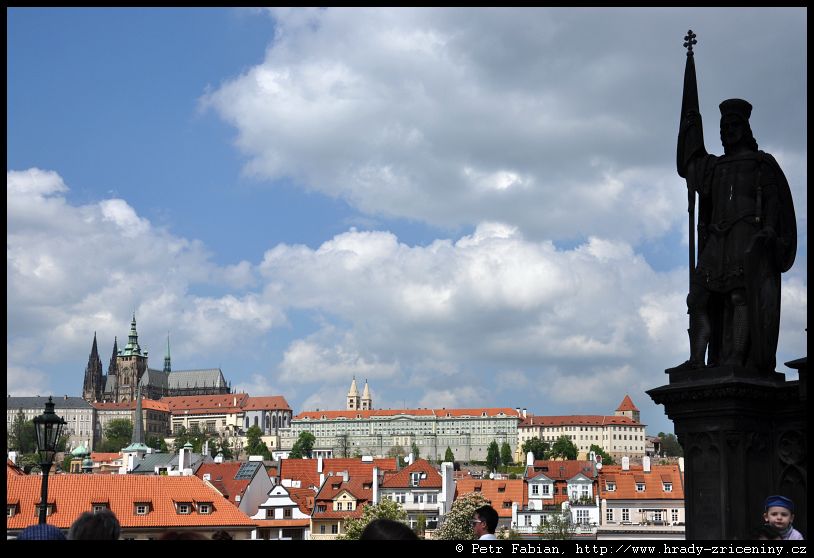 Pražský hrad z Karlova mostu, vlevo Malostranské mostecké věže (2016) |