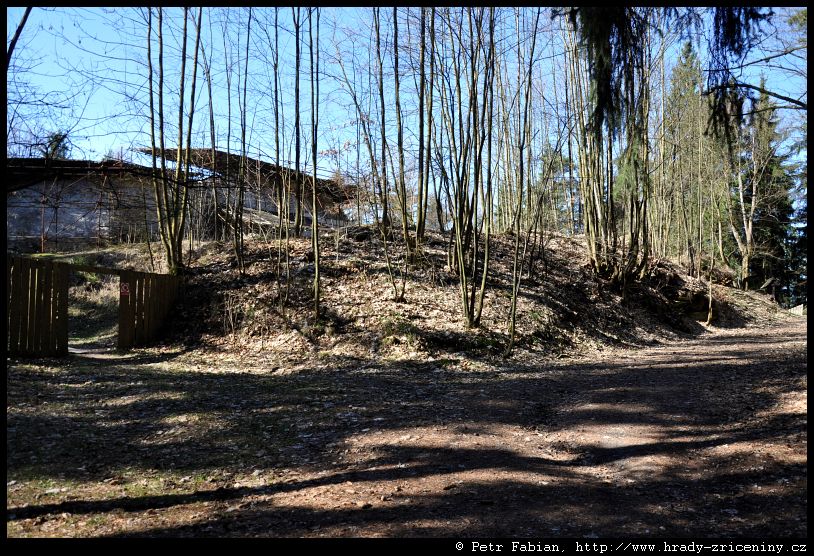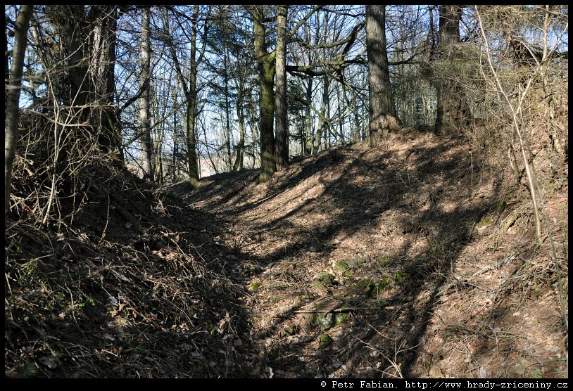 Pravín pohled přes příkop na vnitřní plochu hrádku (2017) |