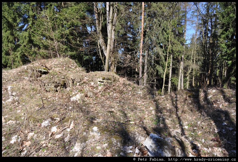 Vlčinec zbytky zdiva, v pozadí příkop a val (2017) |