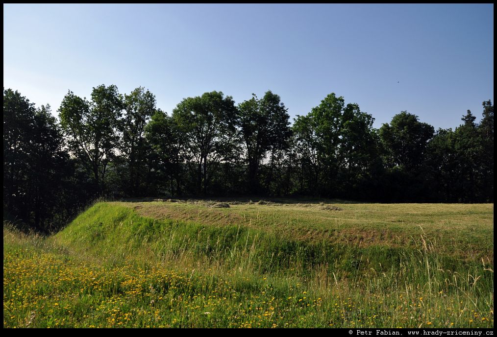 Perná pohled k tvrzišti (vlevo) přes louku od JV (2019) |