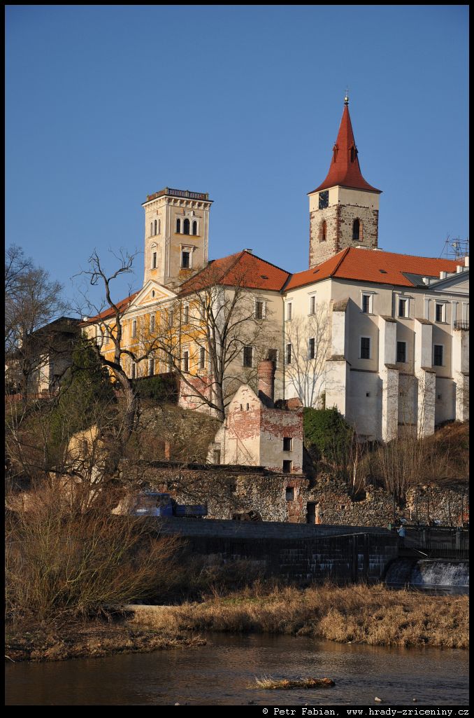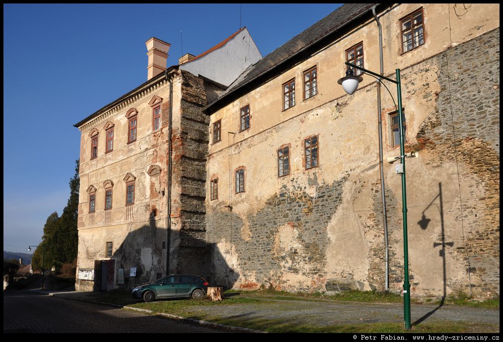 Mirovice v popředí budova s renesančním štítem (2020) |