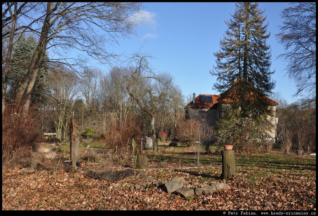 Myšlín zámeček, za ním v pozadí místo tvrziště (2020) |