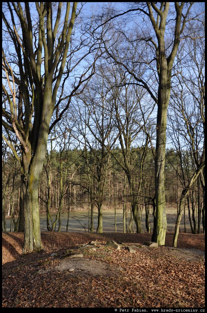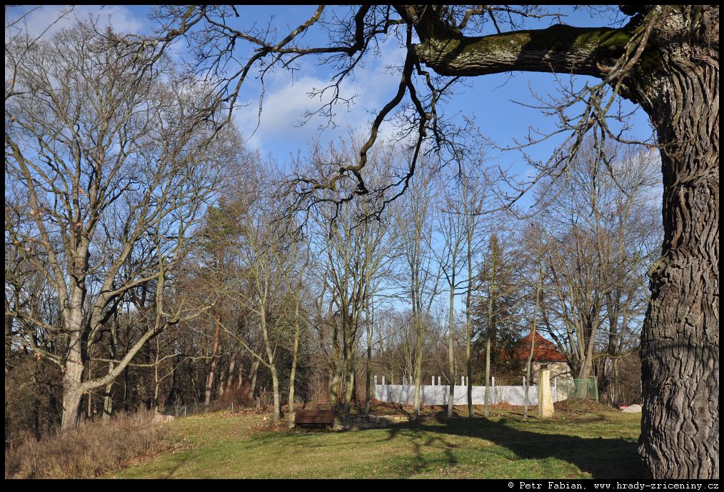 Myšlín Žižkův dub, pohled k tvrzišti a zámečku (2020) |