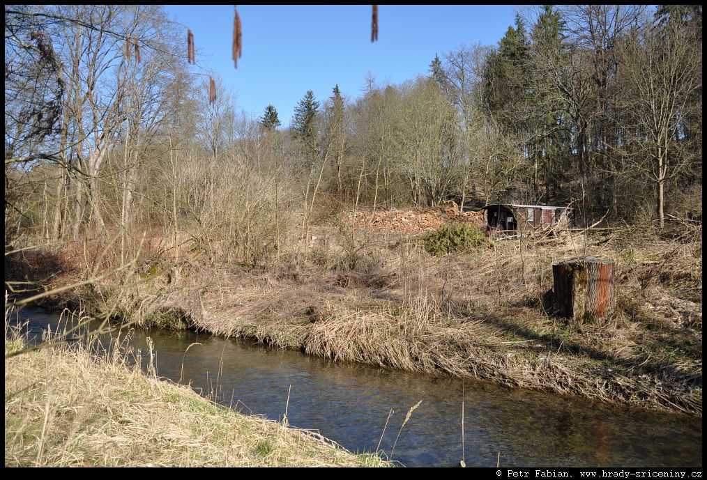 Penčičky pohled k tvrzišti (vlevo) ze svahu nad ním (2024) |