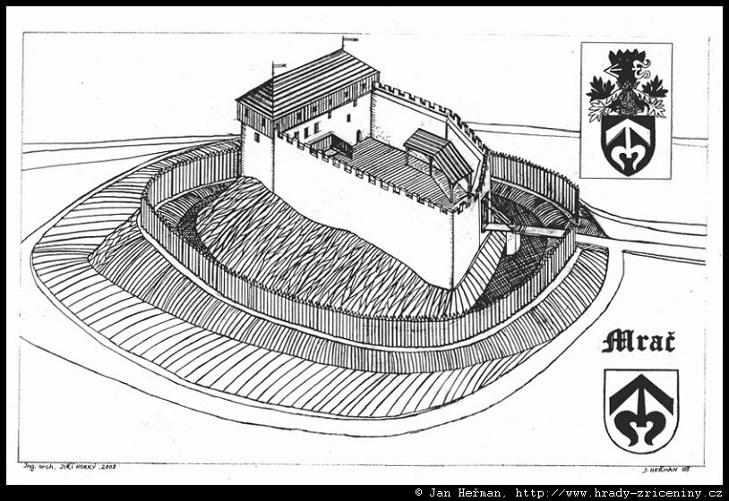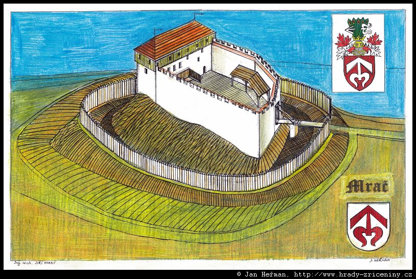 Mrač – Hrádek (starší tvrz) kolem r. 1260 od JV podle M. Rykla