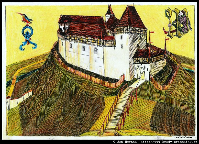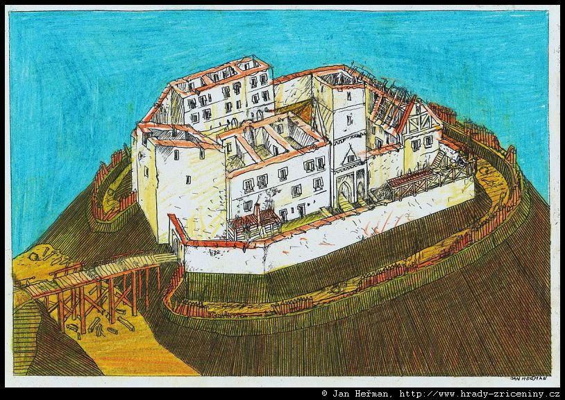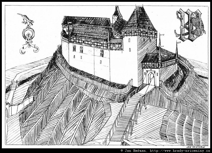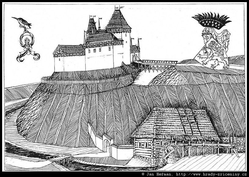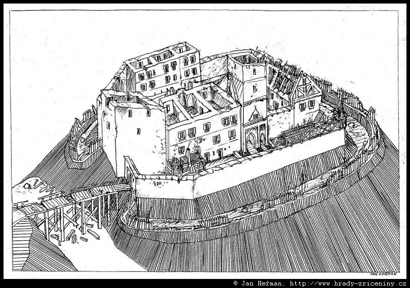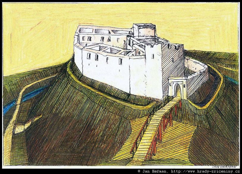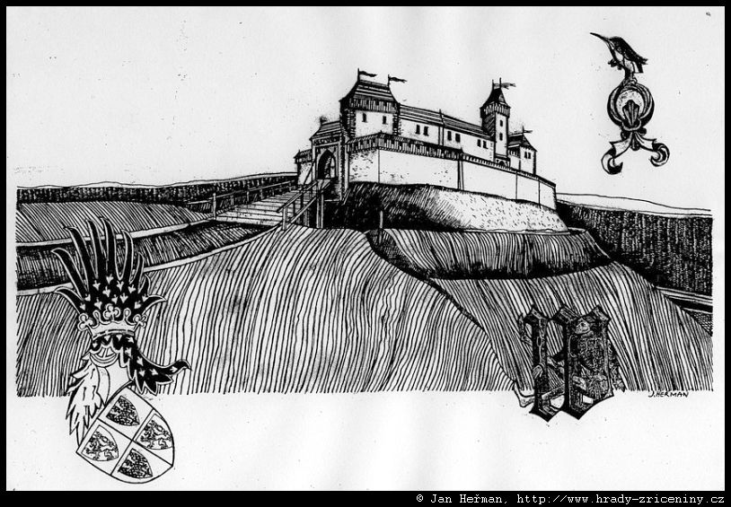 Nový hrad u Kunratic kresby Jana Heřmana podle rekonstrukcí