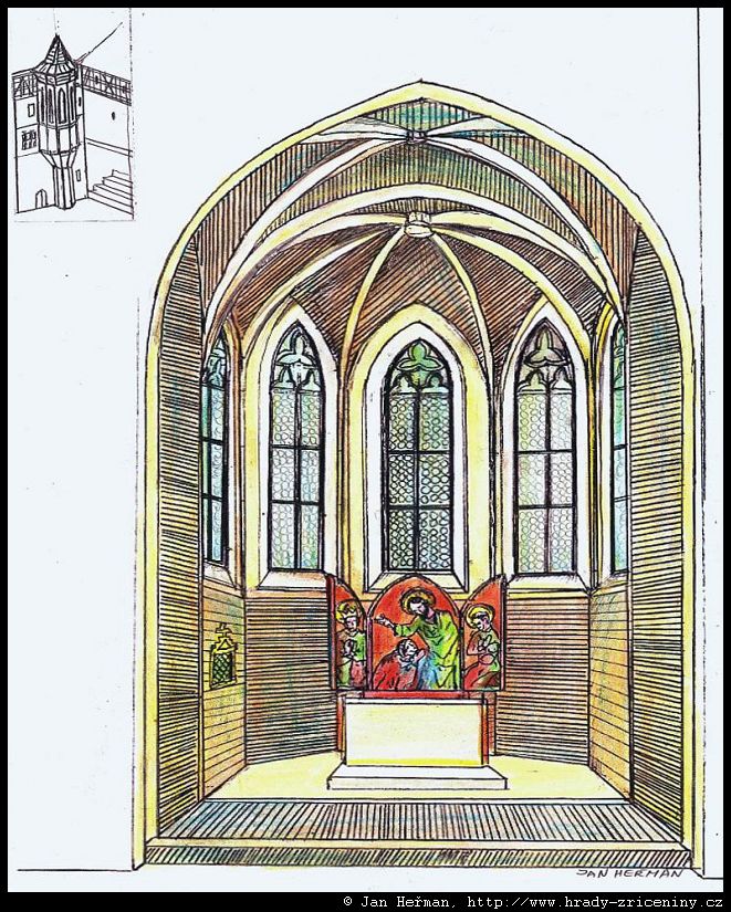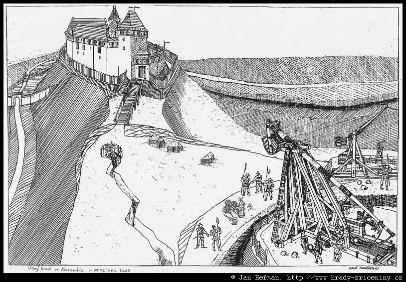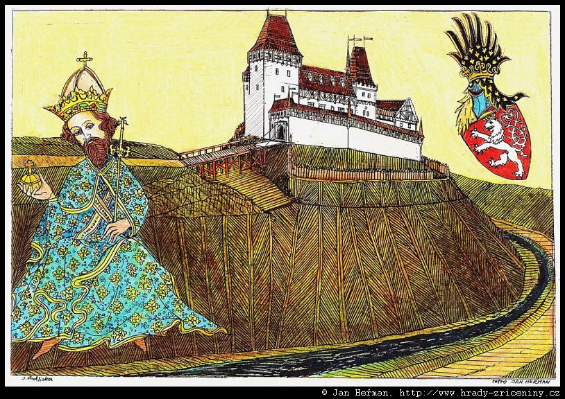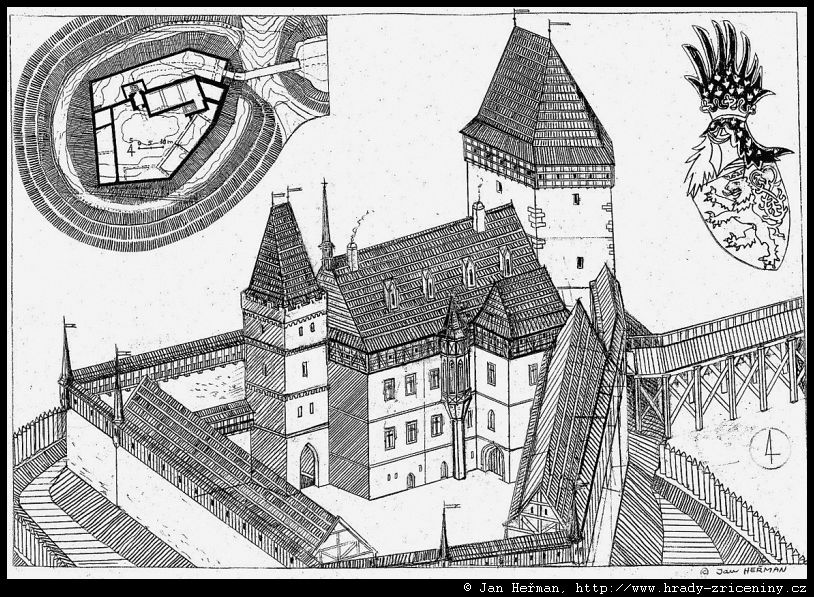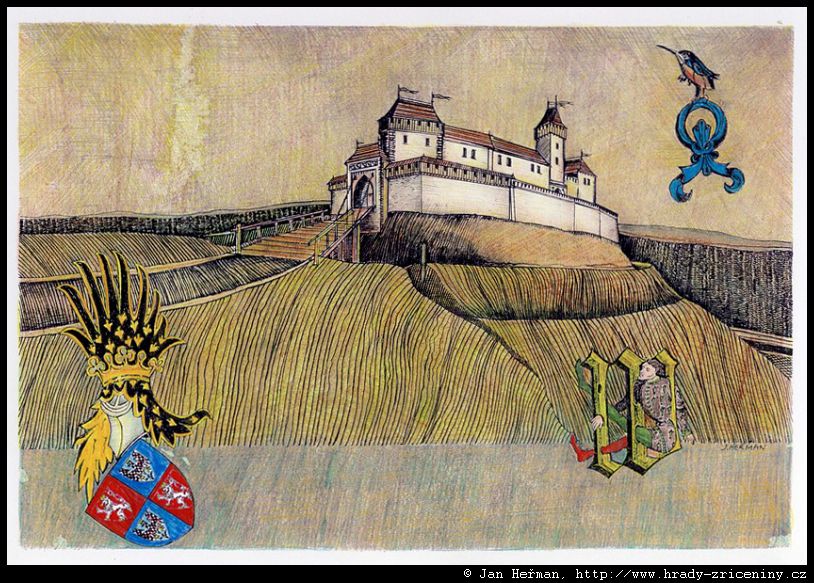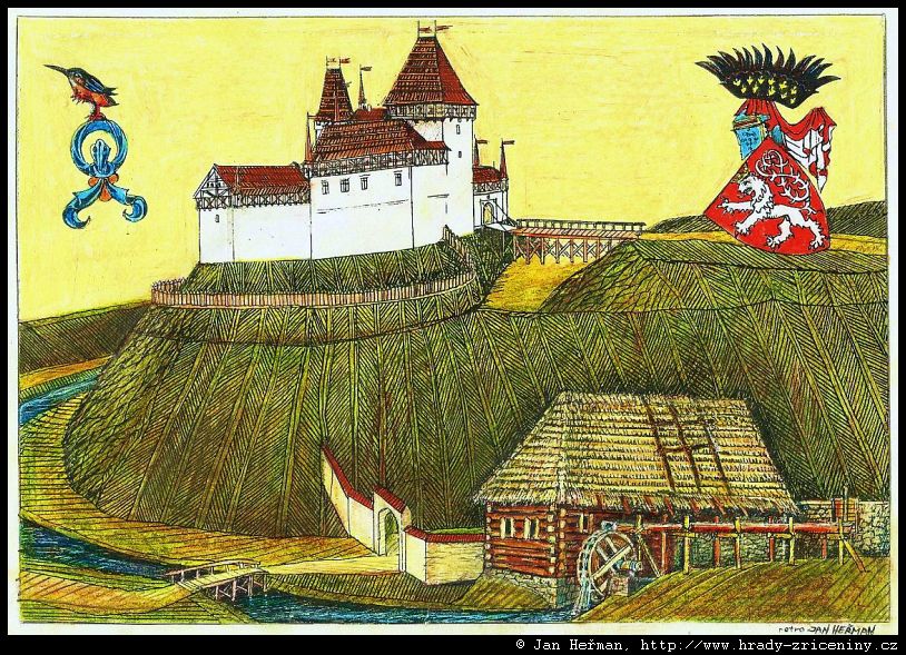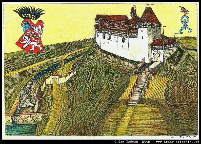 Nový hrad u Kunratic kresby Jana Heřmana podle rekonstrukcí