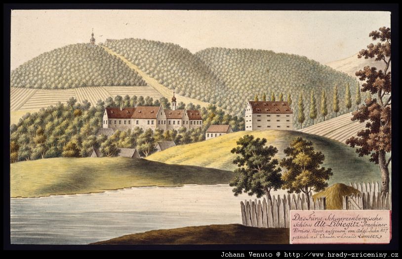 Libějovice u Strakonic Starý zámek, v pozadí Lomec Johann Venuto podle Adalberta Juhna (1807)