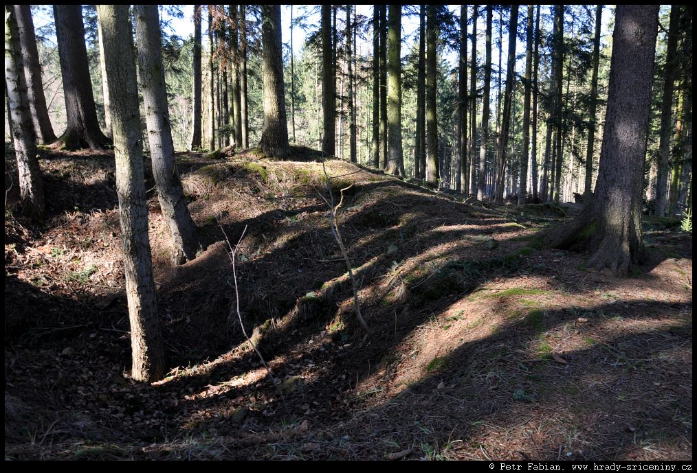 Horní Lhotice horní hrádek pohled přes příkop k S (2019) |