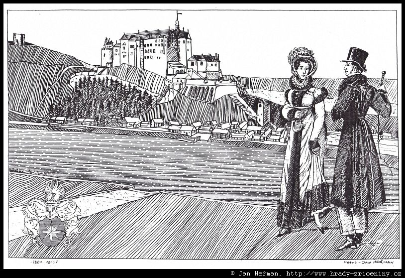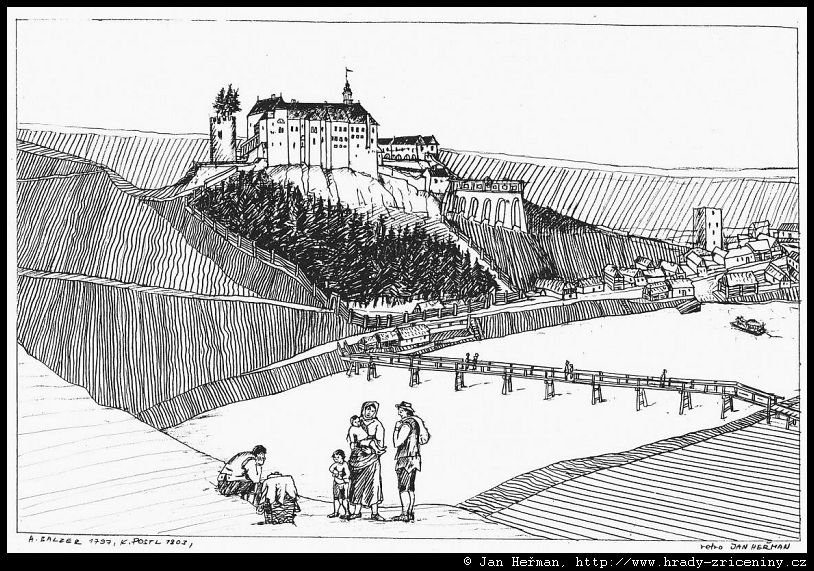 Český Šternberk od JV podle A. Balzera 1797, K. Postla 1803 |