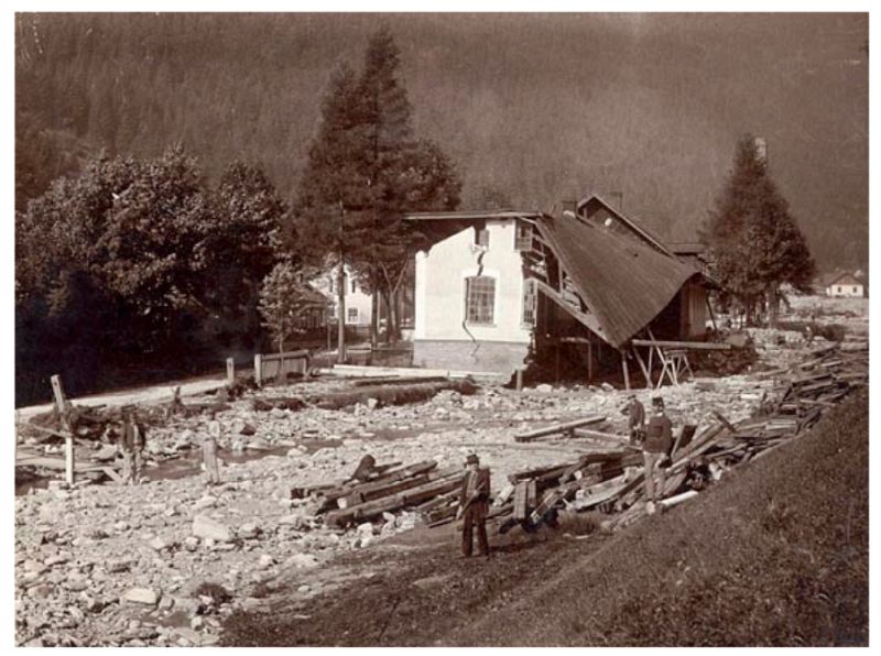 Černý Důl po povodni, vlevo konec ostrožny s Purkhyblem (1897) |